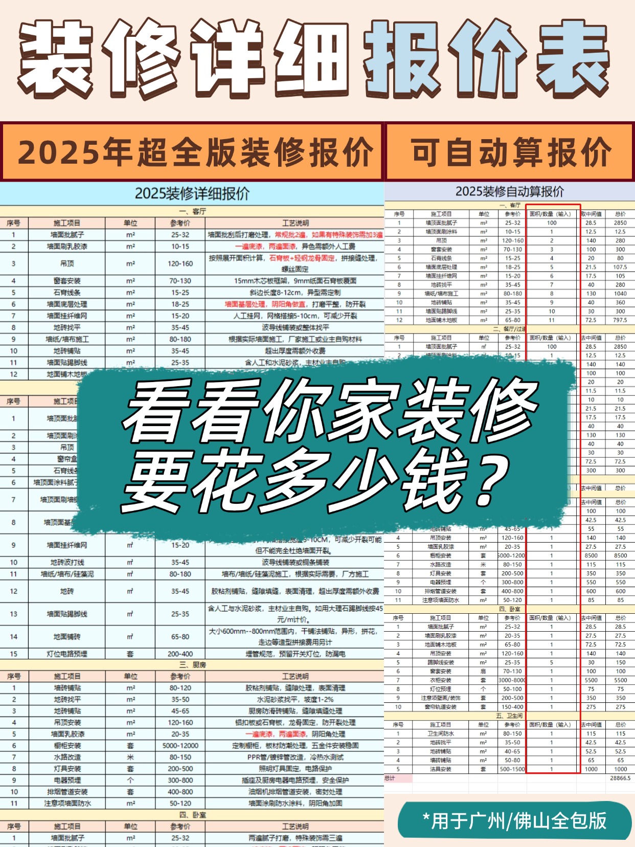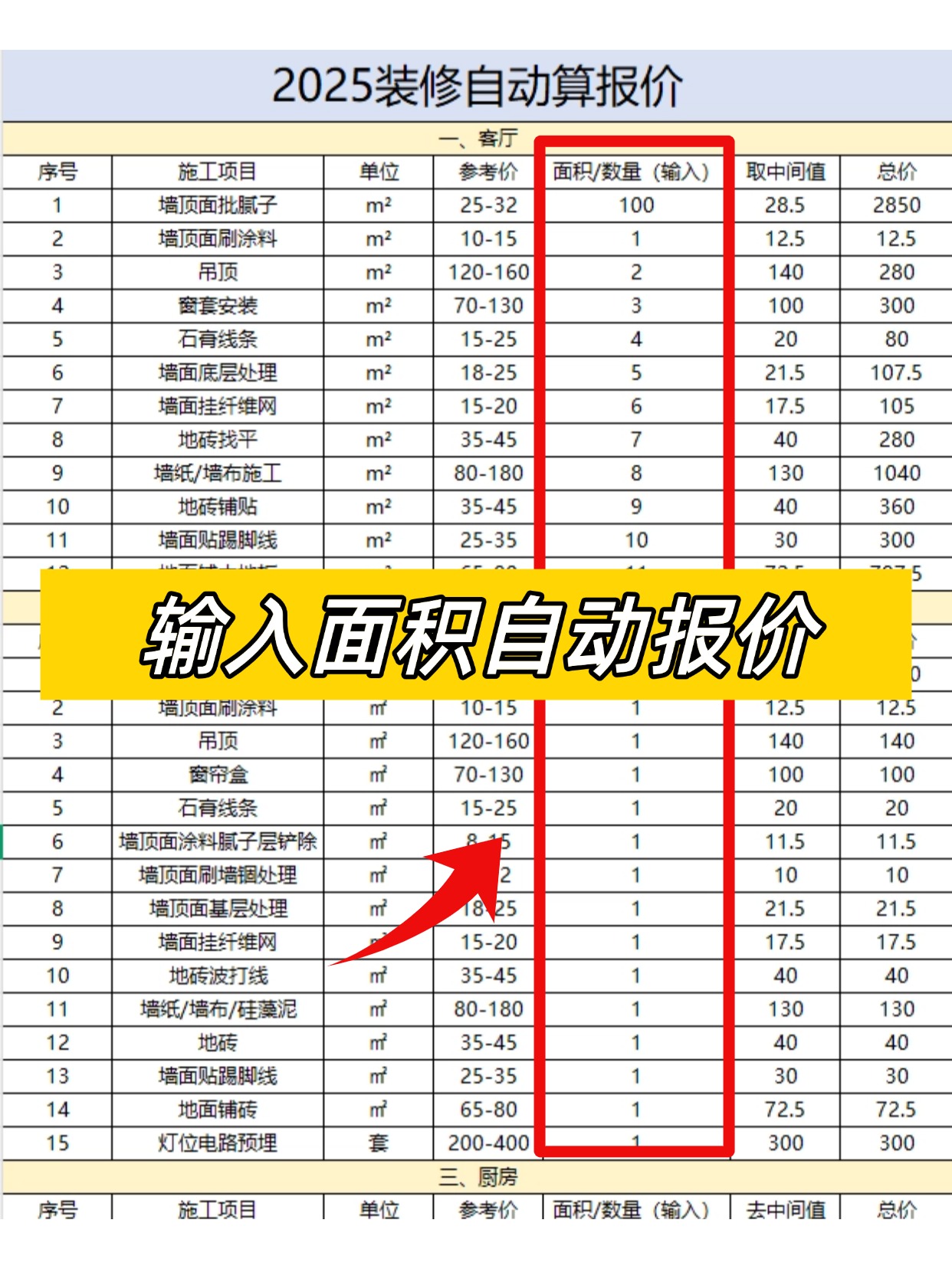 同时拆分人工费、主材费、辅料费等项目,让业主能根据自家面积算清总价。